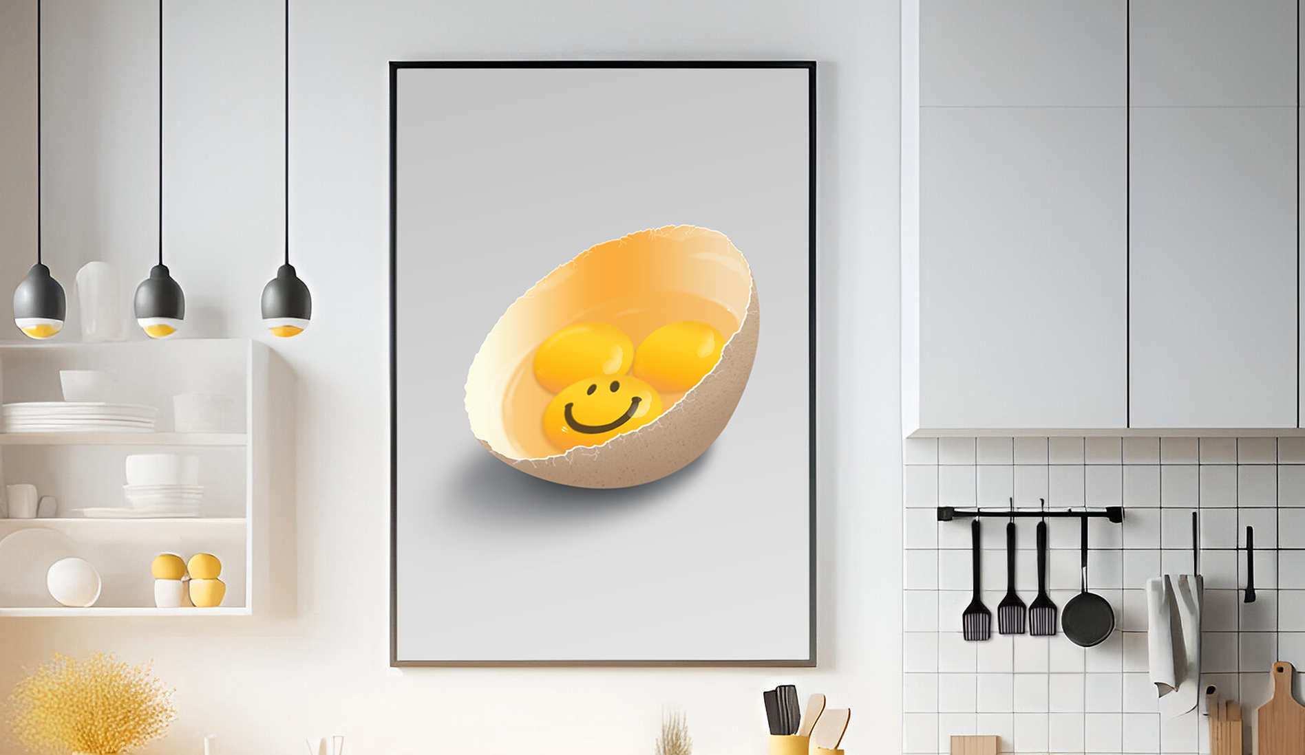 This piece was my first digital painting, focusing on realism with a playful twist. Using Photoshop, through light and shadow techniques, I created a cracked egg with yolks that smile back at you, adding a lighthearted element. The AI-generated kitchen mockup was retouched to blend seamlessly with the artwork, enhancing its presentation. Prepared for a 70x90(cm) print in CMYK, this project combines simplicity with creativity. Created in 2022.