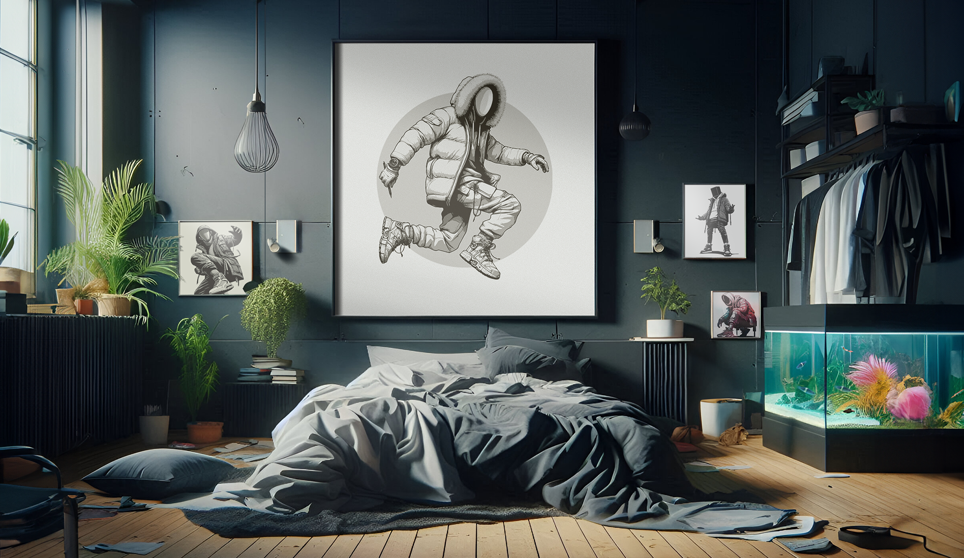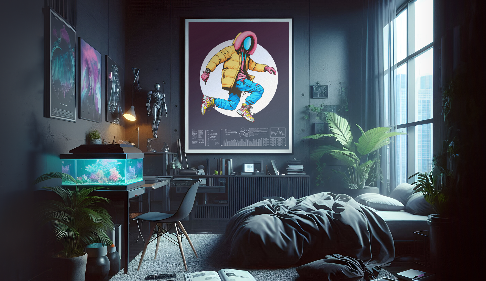 This illustration marks the beginning of "LOW2," a sci-fi graphic novel project and an integral part of my personal branding as a mascot. Created entirely in Illustrator, the artwork depicts an original character, blending streetwear aesthetics with a futuristic edge. Designed in three color variations, and a print size of 70x100(cm). Displayed in different moods, as reflected in the customized 'AI' mockups made to blend with each tone style. Created in 2023, this design is set to lead an upcoming merchandise collection.