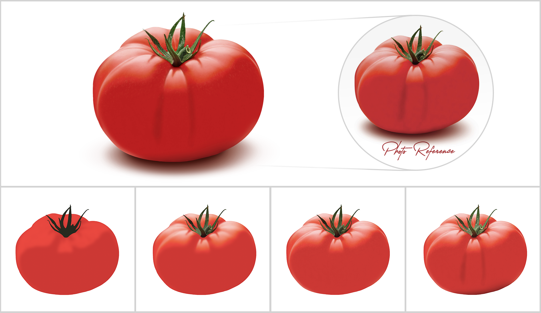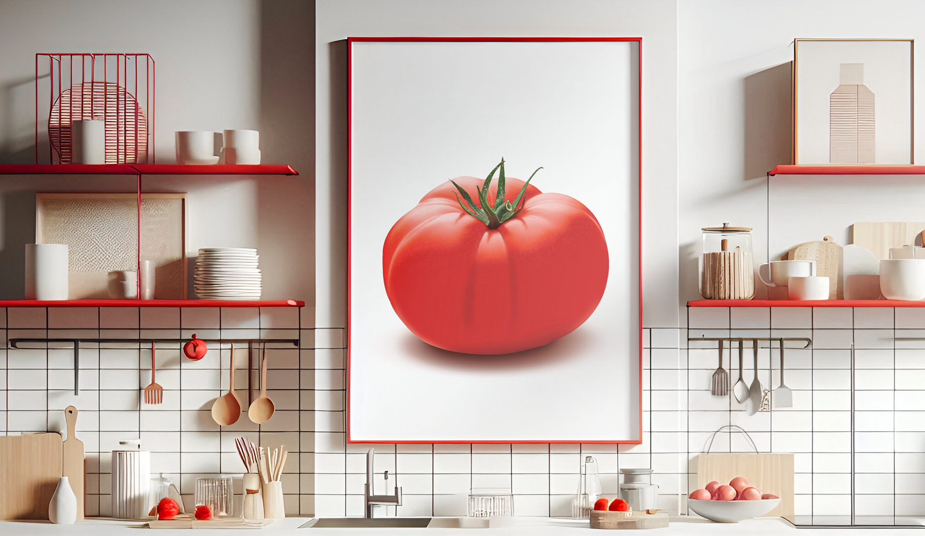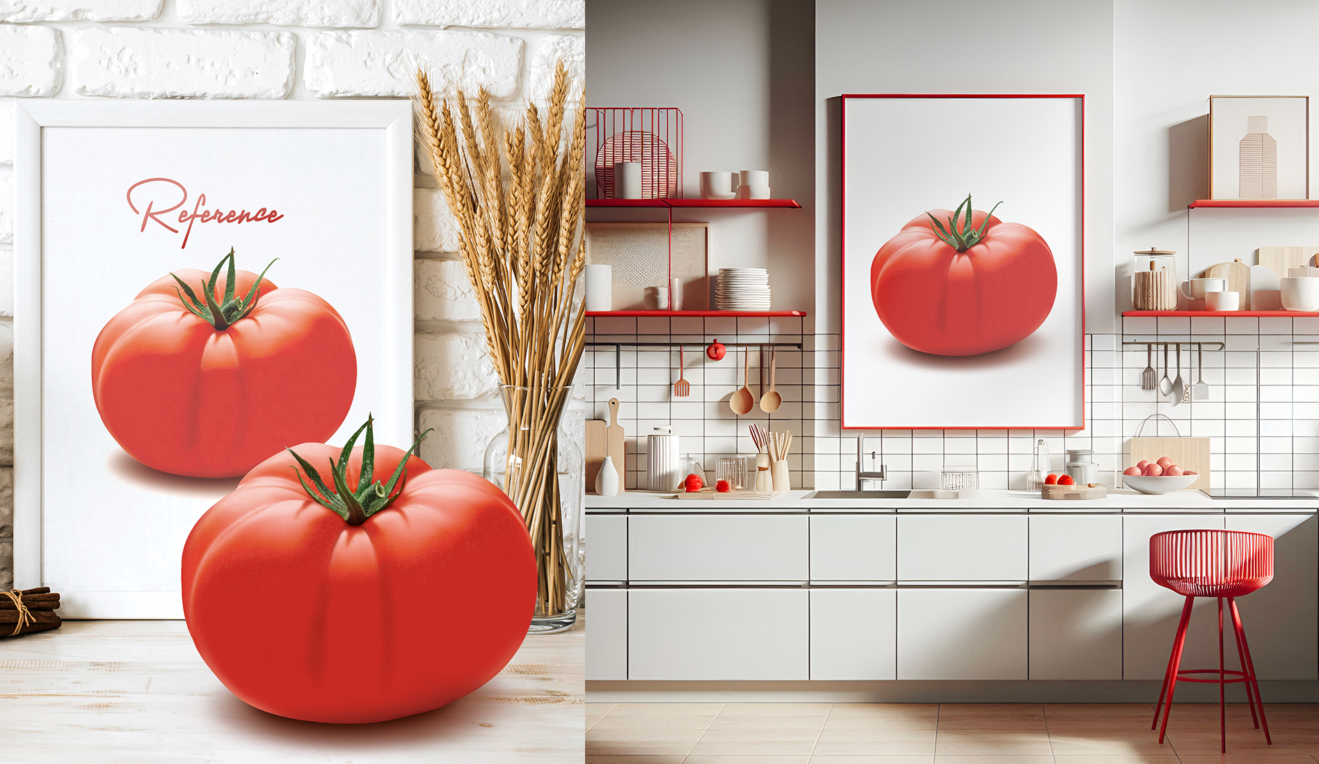 This digital painting aims to recreate a realistic tomato, following a reference photo for accuracy. Though seemingly simple, capturing the nuanced texture, highlights, and shadows required patience, especially with limited painting experience. The AI-generated mockup, retouched for presentation, enhances the artwork’s context. The piece is ready for printing in CMYK at 70x90 cm, reflecting a balanced approach to color and realism. Created in 2022.