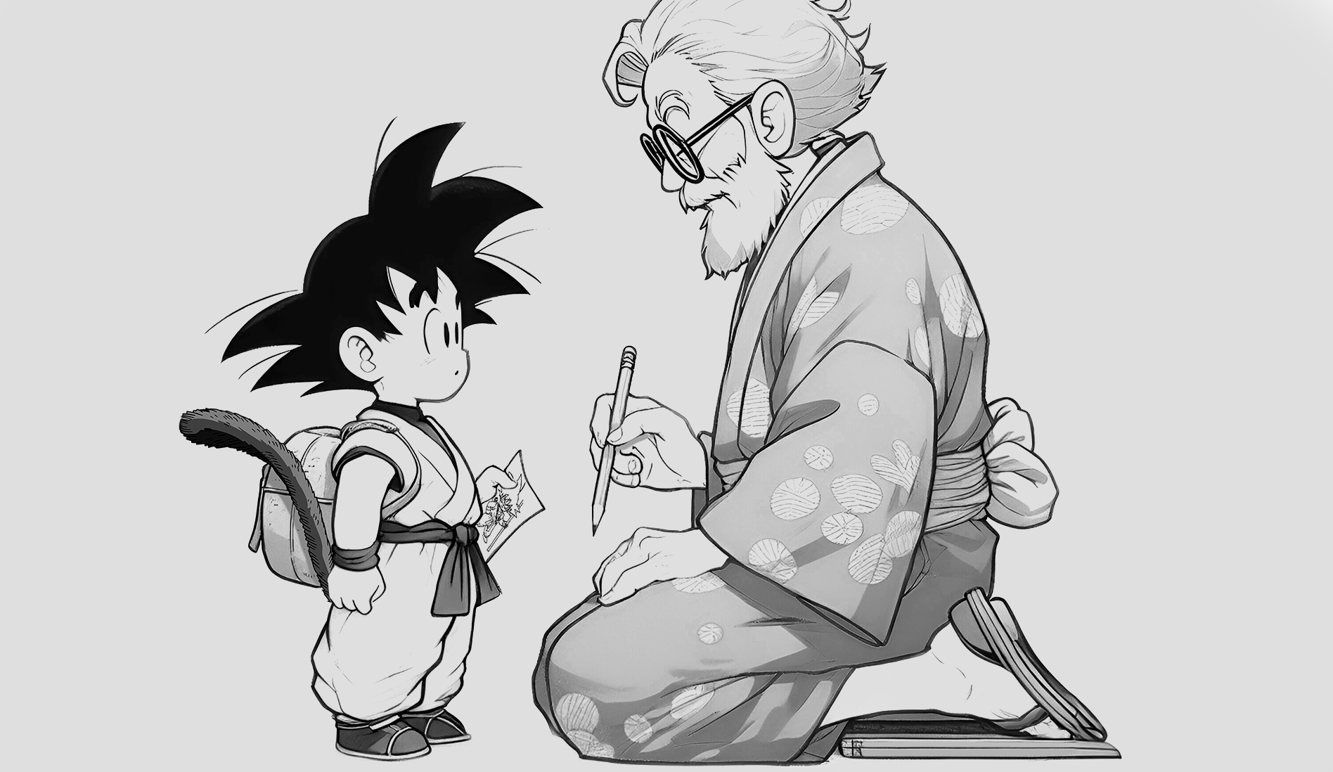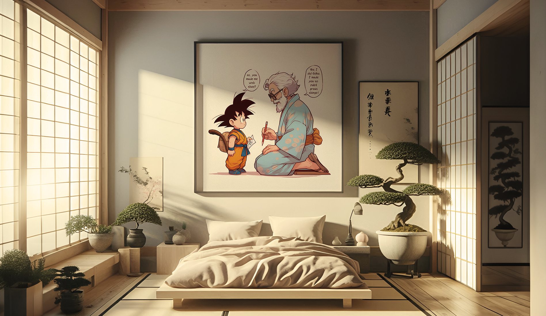 This piece is a tribute to Akira Toriyama, crafted soon after his passing. Portraying the artist with Son Goku, his most iconic character, in a touching exchange that conveys purpose and affirmation. The artwork represents the bond between the creator and creation, a statement of resilience and legacy. Drawne and painted in Photoshop, this piece was prepared in CMYK for 120x120(cm) print. An 'AI' mockup room, evokes a traditional Japanese atmosphere, paying homage to Toriyama's cultural roots. R.I.P.