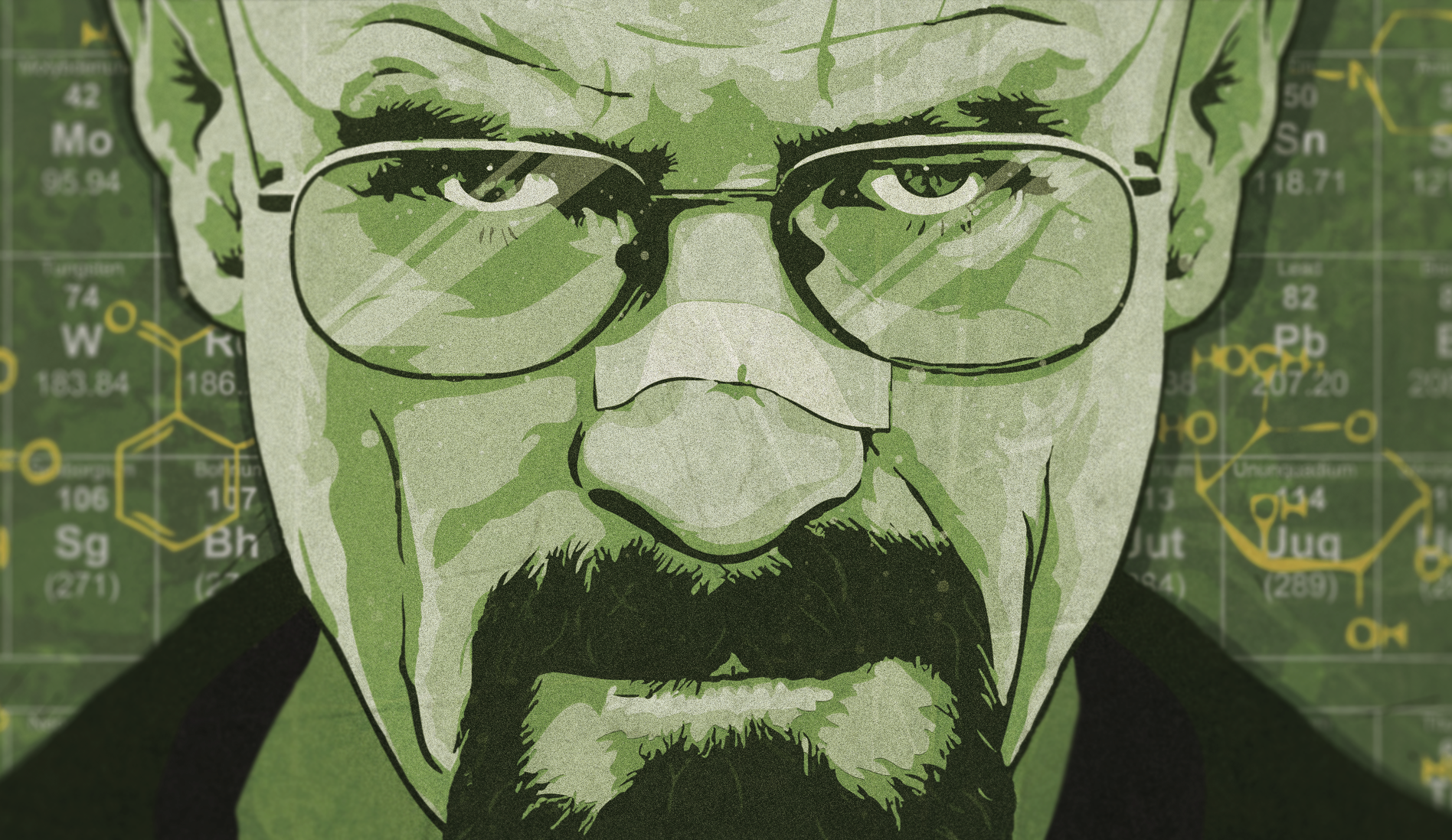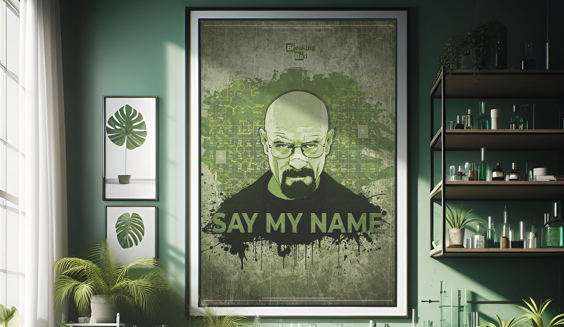 Tribute to the iconic series "Breaking Bad", capturing Walter White in his most infamous persona. Created in Illustrator with final touches in Photoshop, featuring the intense gaze of Walter, complemented by his memorable phrase "Say My Name". Behind him, a periodic table and amphetamine molecular structure echo the show's narrative. Produced for large-scale printing in CMYK at 84x119(cm). A retouched 'AI' room mockup adds subtle lab-like details, reminiscent of Heisenberg's world. Created in 2012.