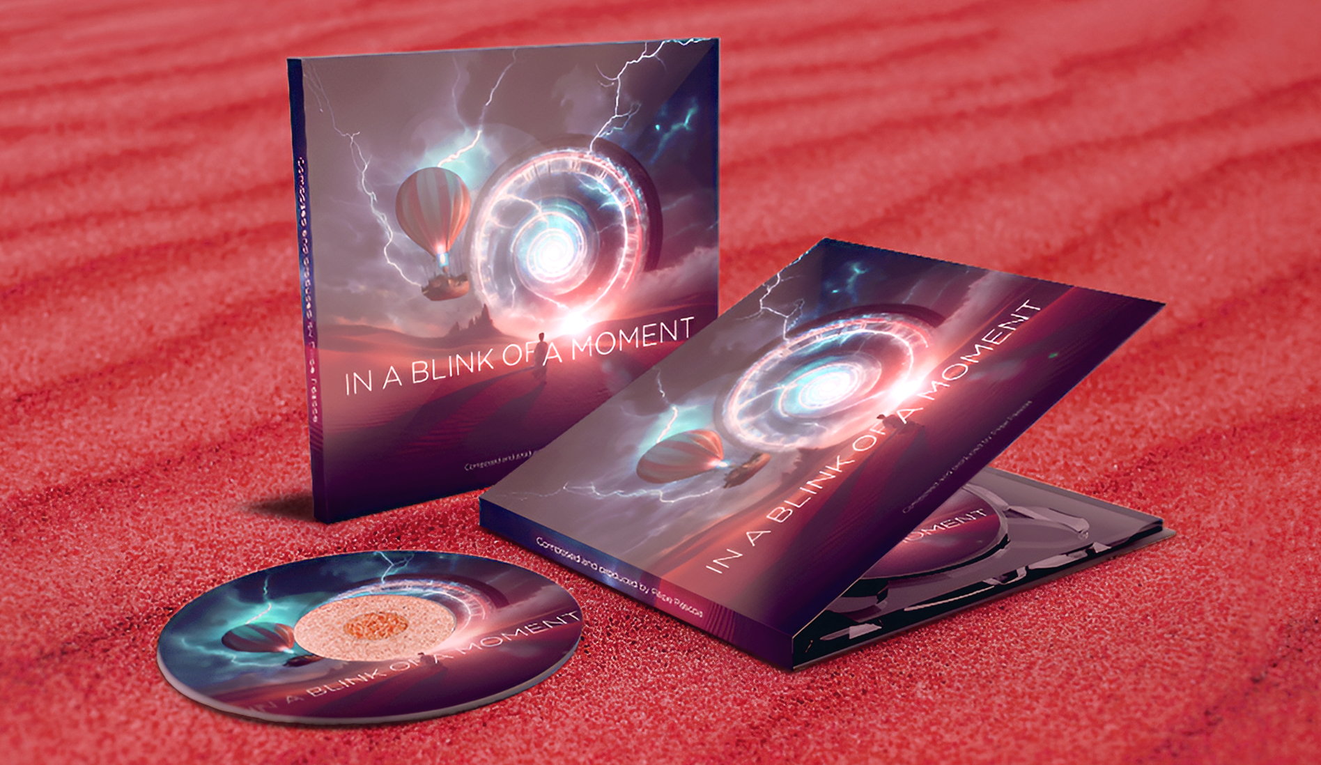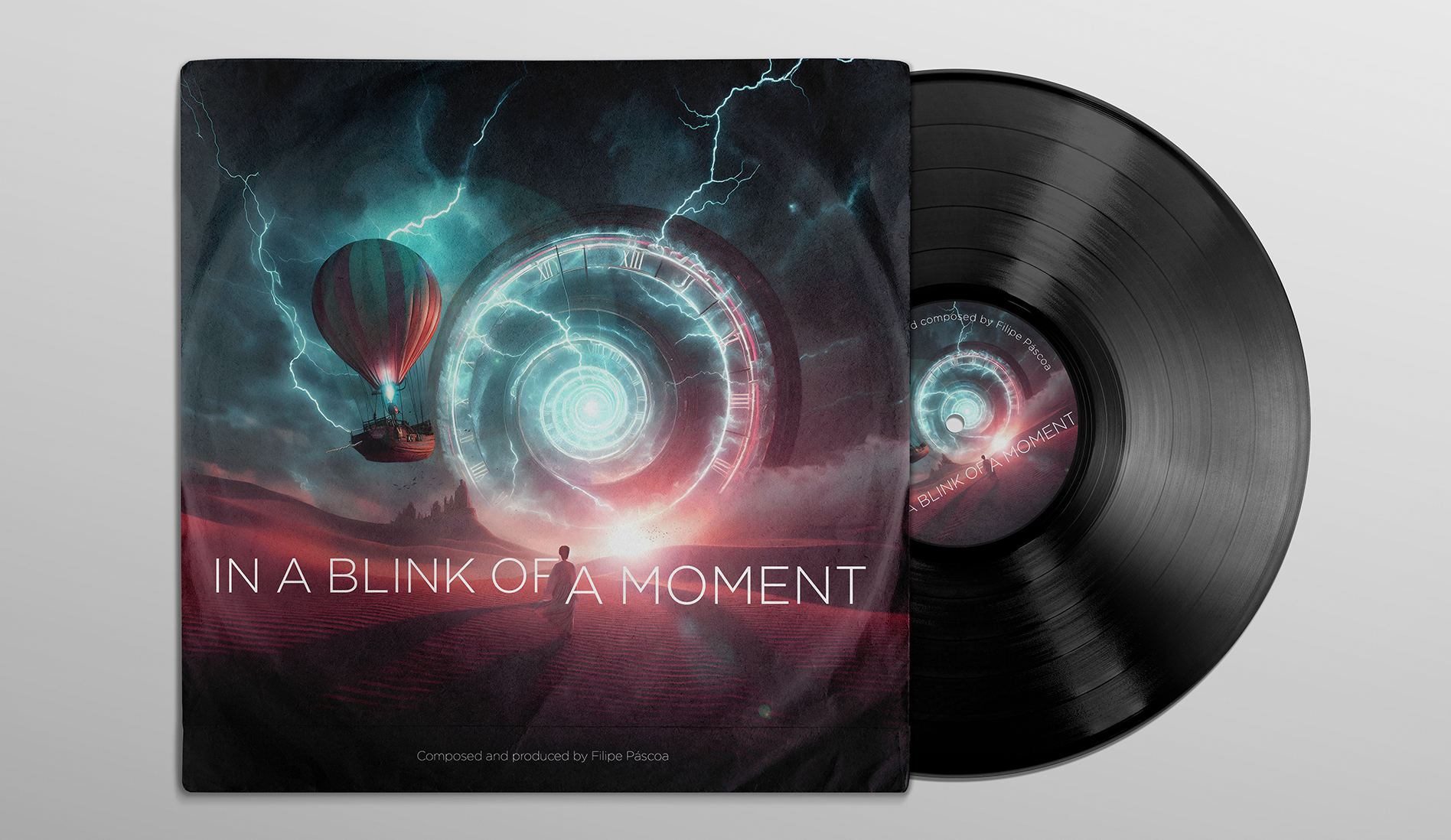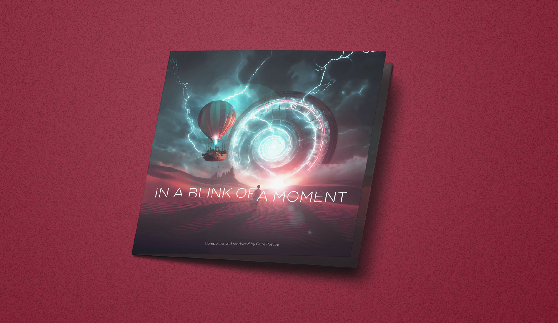 This album cover captures the essence of Filipe Páscoa’s music, merging surreal visuals with intricate design elements. The clock structure, mountain, and text were crafted in Adobe Illustrator, while the rest was a blend of edited photographs, composed in Photoshop. The scene brings a sense of timeless adventure, with elements like the clock portal and hot air balloon sparking wonder. Created in 2023, this artwork visually interprets the journey and emotions within the album, presented across multiple formats.