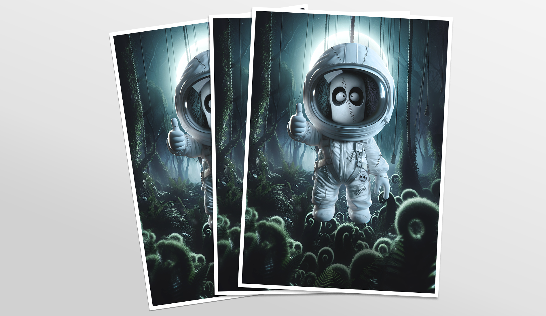 This piece showcases a cartoon astronaut character in a mysterious forest, inspired by Tim Burton's distinctive art. The artwork mixes photomanipulation with painted elements, all crafted in Photoshop. Finished in CMYK for an 84x119(cm) poster, the project emphasizes a whimsical and weird contrast that define the style. Finished in CMYK for an 84x119 cm poster, the project captures an surreal atmosphere. The room mockup was AI-generated and retouched for a cohesive presentation. Created in 2023.