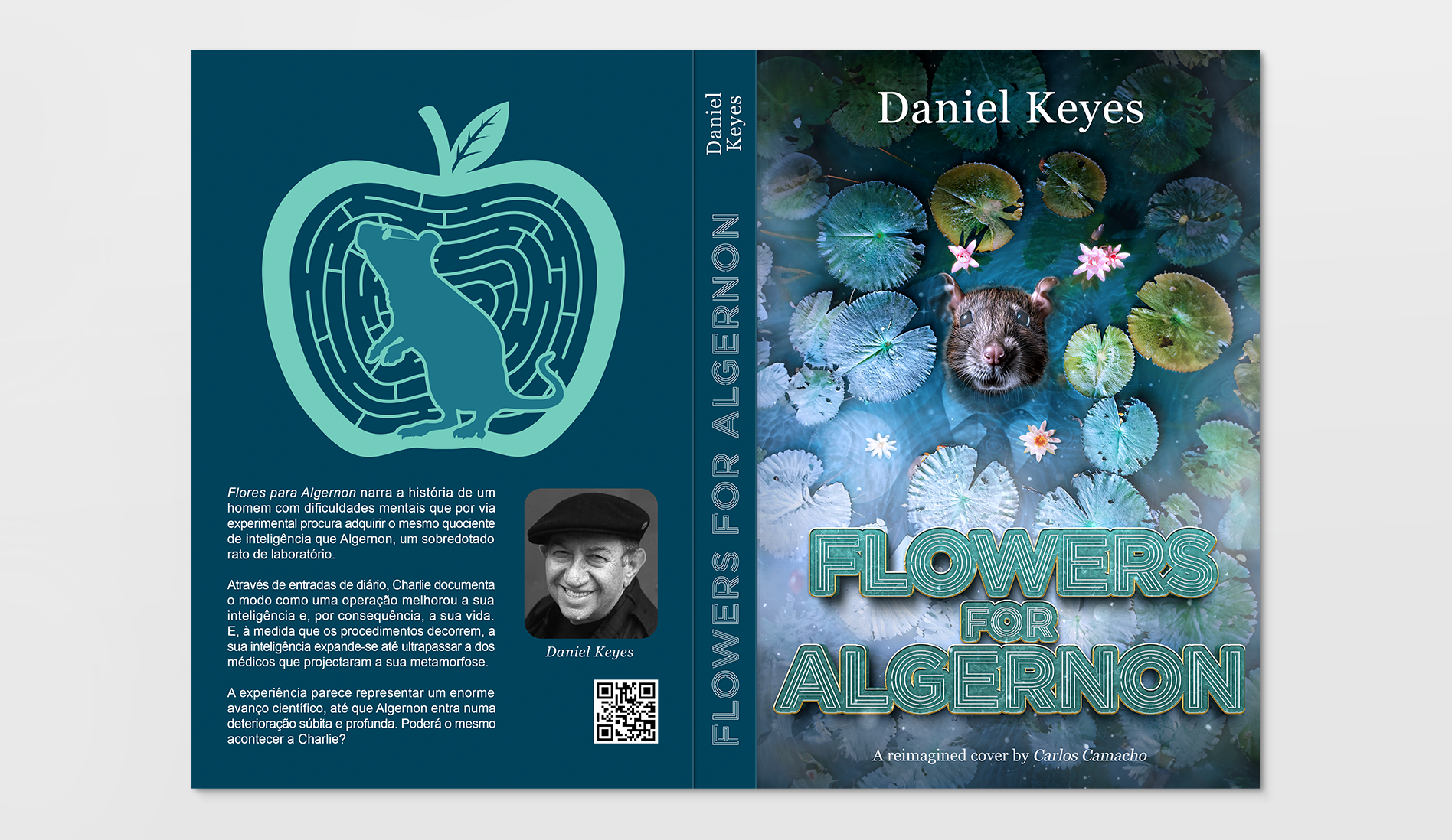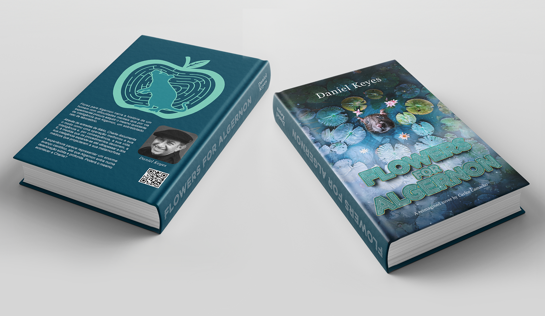 A reimagined cover for "Flowers for Algernon" reflects the emotional complexity of the story. The front was inspired by the painting of "Ophelia". Water lilies float above a serene pond, echoing the fluctuating mental journey of both Algernon and Charlie. The back cover, created in Illustrator, uses a maze featuring Algernon, capturing the symbolic pursuit of intelligence and self-discovery. This school project, created in 2023, blends visual symbolism with thematic coherence to honor Daniel Keyes' powerful narrative.
