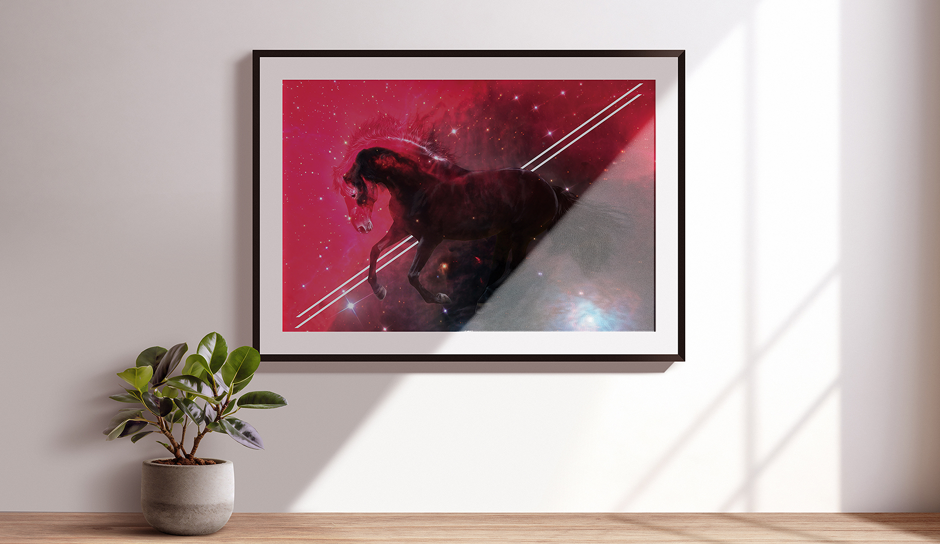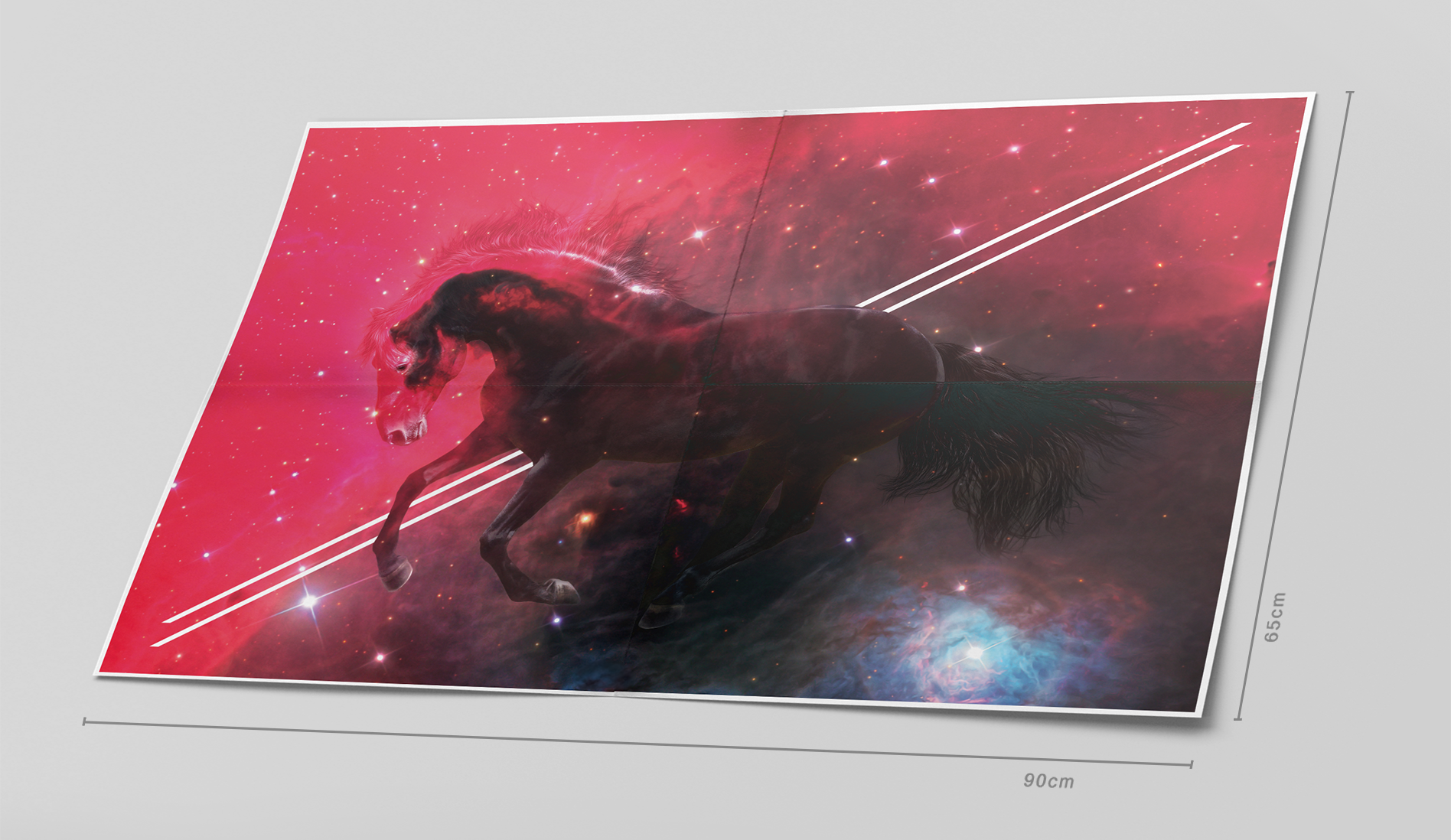 This artwork blends Earth & Cosmos, using a double exposure effect to combine a horse photograph with an infrared image of the Horsehead Nebula. Edited in Photoshop, the piece captures the horse movement against a backdrop of interstellar reds—shaped by hydrogen and magnetic fields from distant stars. Prepared in CMYK and scaled for a 70x100(cm) poster. Created in 2011, this work aims to evoke a sense of wonder at the interplay between earthly and celestial forces.