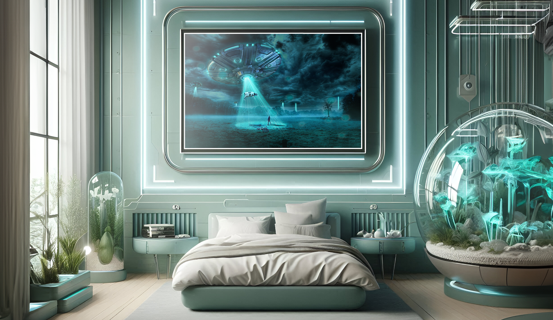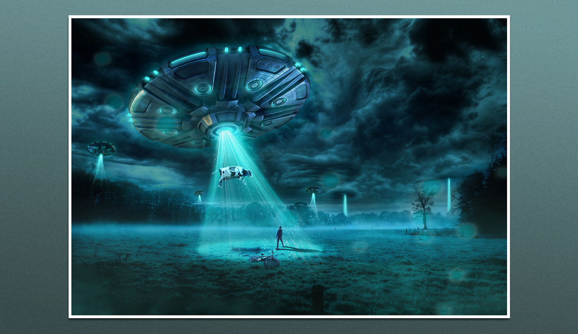 This photomanipulation captures a surreal alien abduction scene, blending different photographic elements into a cinematic moment. The image was crafted in Photoshop by editing various components. Color grading and atmospheric effects were applied to merge the individual pieces into a seamless, sci-fi environment, with cool blue tones adding mystery to the mood of the context. Finished in CMYK for a large prints, with 'AI' futuristic room mockups to set the poster in a unique context. Created in 2023.