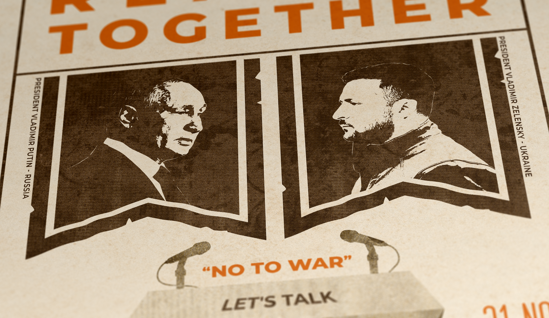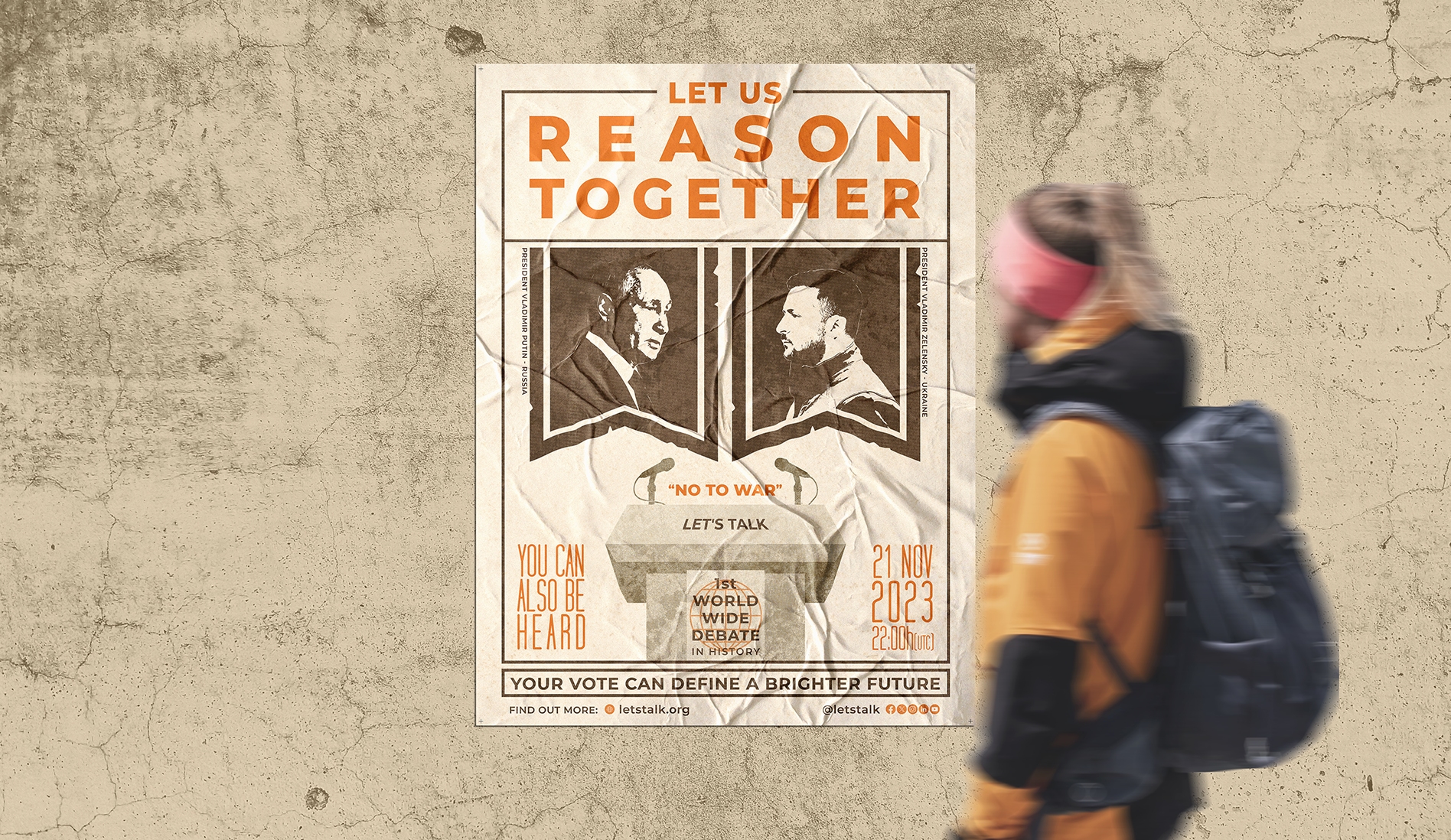 This fictional poster envisions a world-changing debate between Putin and Zelensky, promoting dialogue for peace. The artwork highlights the power of communication and collective involvement. A concept centered on a interactive debate, enabling worldwide interaction via Q&A submissions and votes, bridging the gap between leaders and citizens. Blending Illustrator and Photoshop, it mimics vintage protest posters through a halftone process for screen printing. Designed for a school project in 2023.