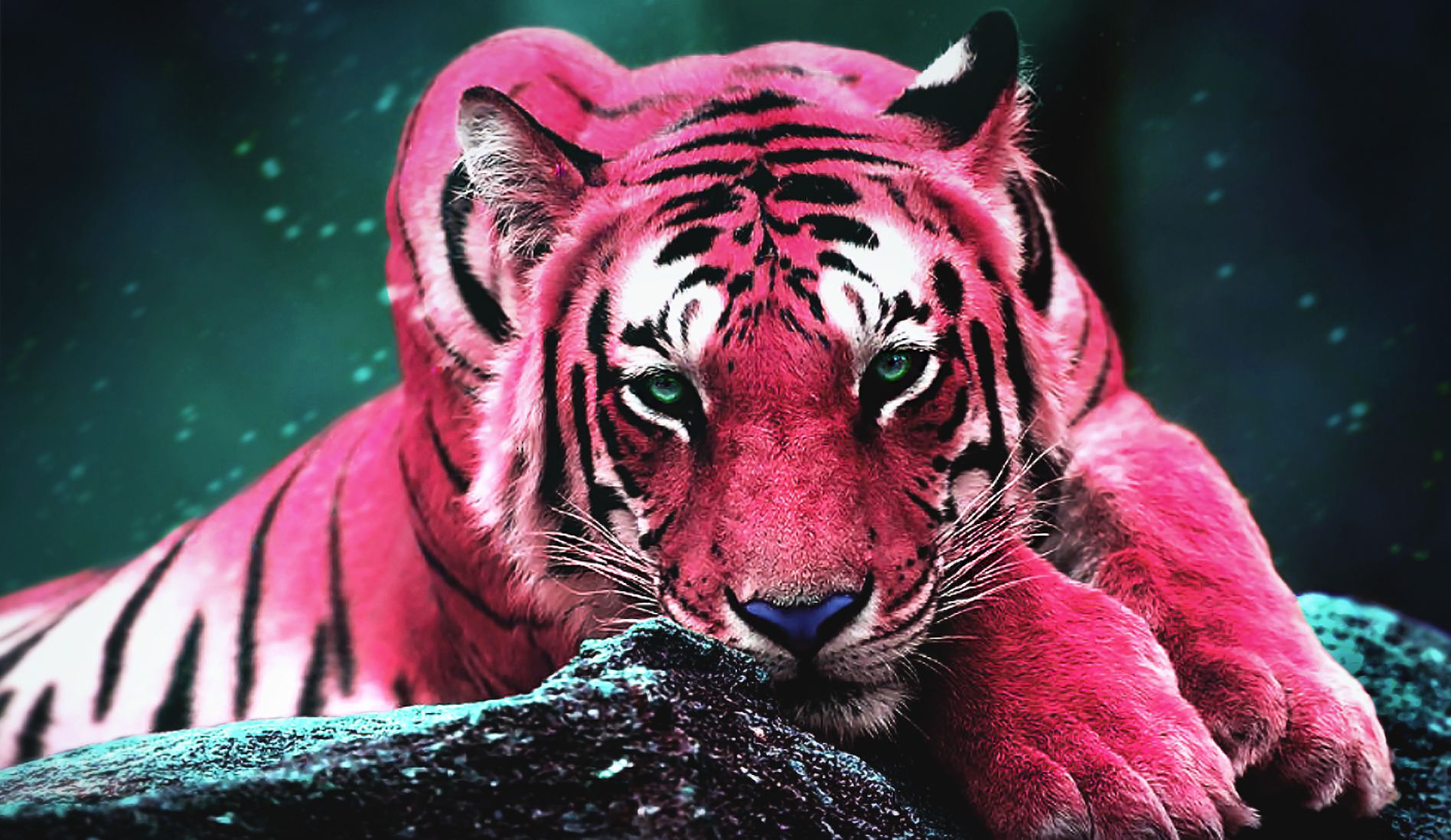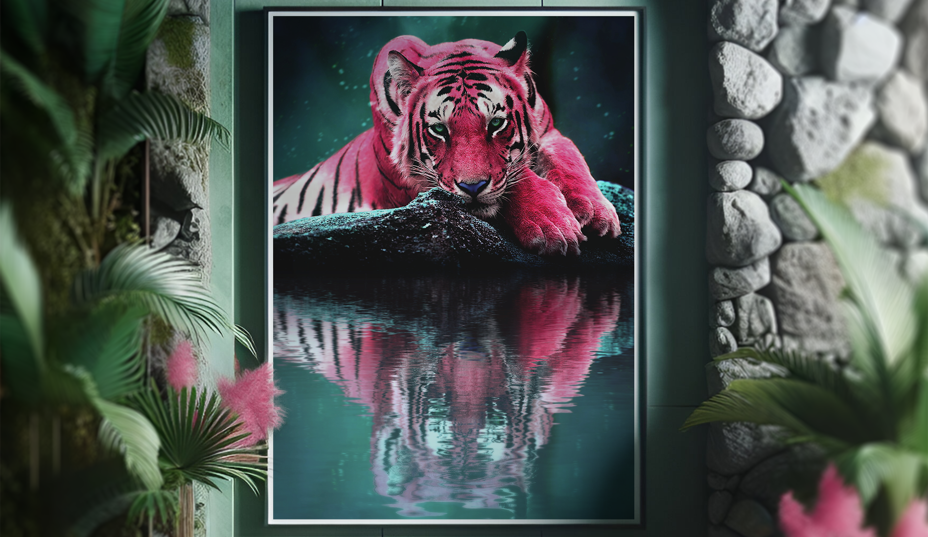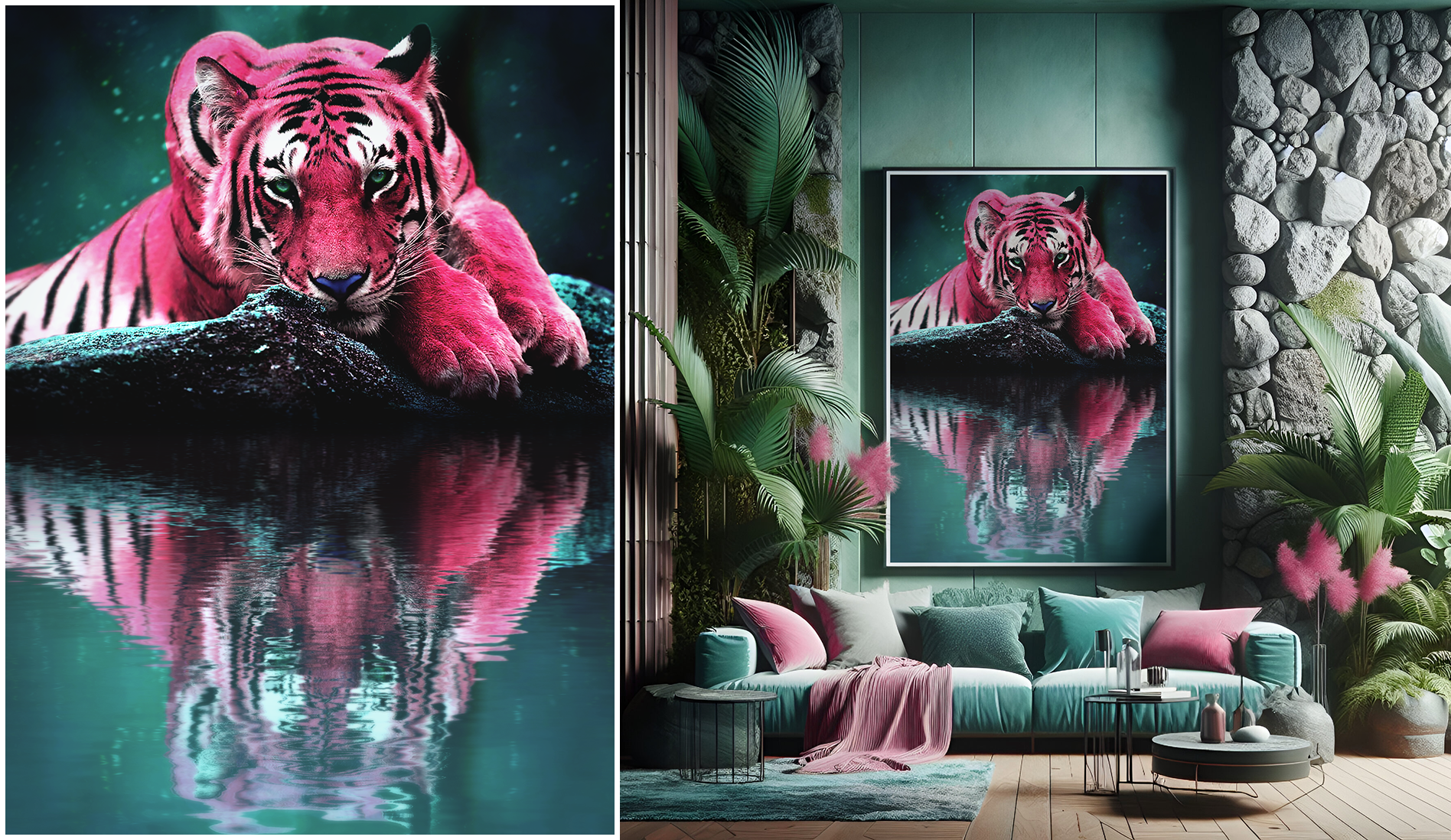 This image brings a surreal twist to the natural beauty of a tiger, resting with its reflection mirrored in calm waters. Created as an exercise in displacement mapping, the piece explores how reflections can be manipulated for realistic effects. Started with a tiger photo, where the colors were converted for a vivid, fantasy aesthetic, adding a rock from another source to enhance depth. The final piece was edited in CMYK for printing at 84x119(cm). The living room scene was AI-generated and retouched. Created in 2023.