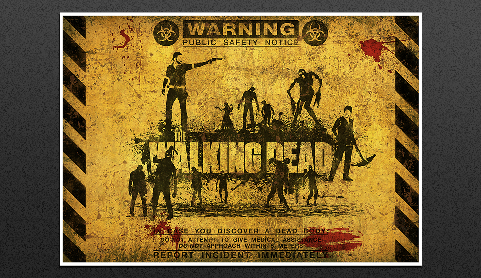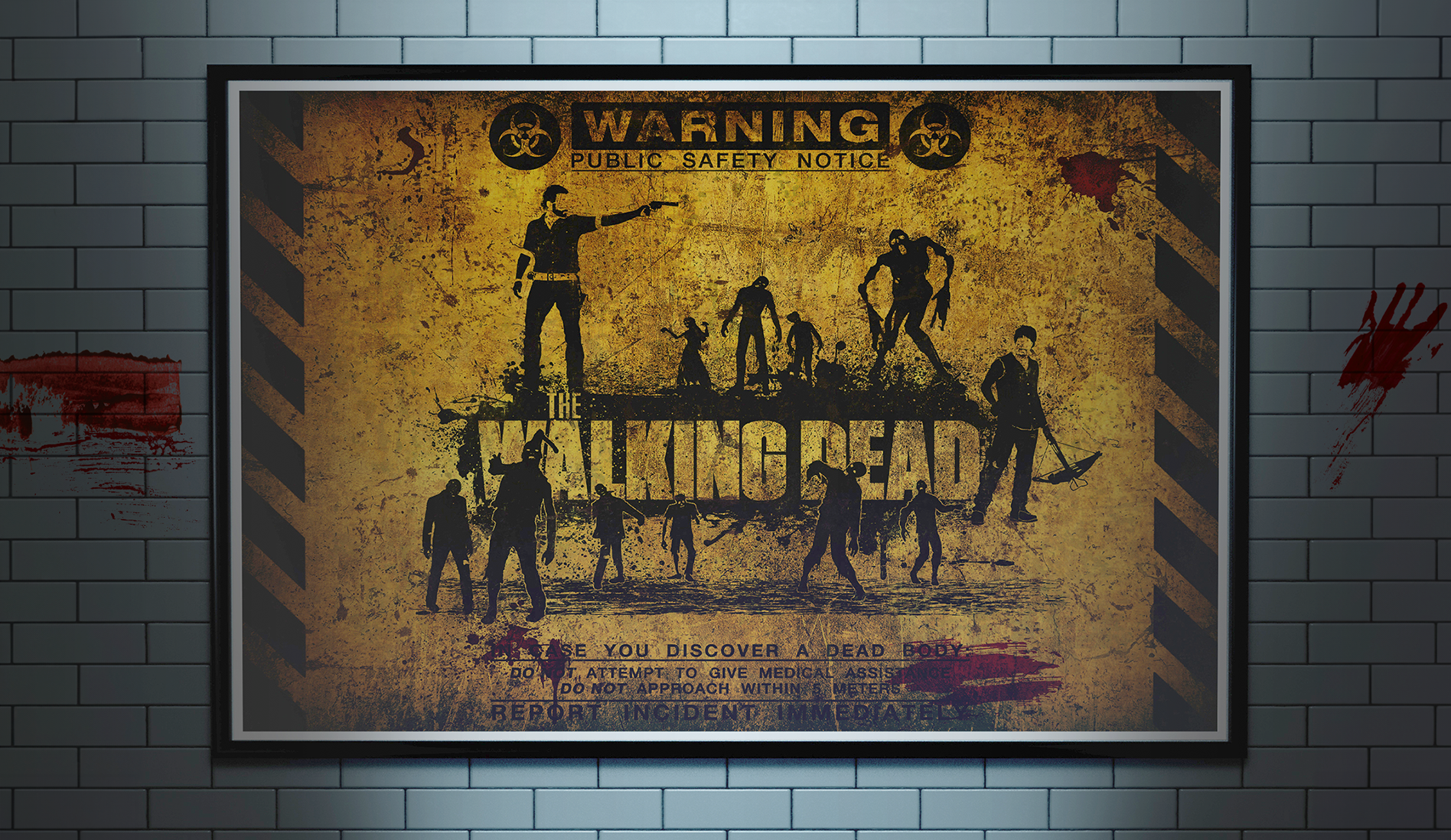 This vector tribute to "The Walking Dead" merges sharp design with gritty, apocalyptic textures. Initially crafted in Illustrator, the artwork was brought to life in Photoshop through added layers of worn textures and splattered blood, capturing the chaotic and raw essence of the series. The composition reflects the tension of a zombie outbreak, balancing order with the chaos of survival. Finalized in CMYK for a 100x70 cm print, this piece embodies the show's iconic distress. Created in 2012.