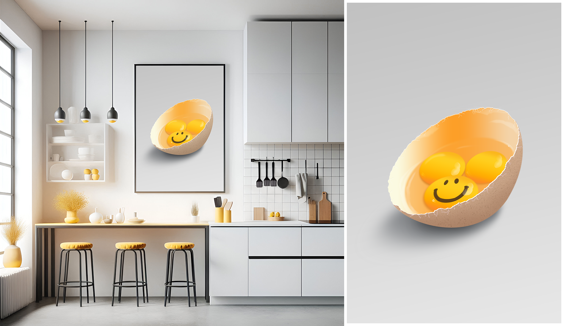 This piece was my first digital painting, focusing on realism with a playful twist. Using Photoshop, through light and shadow techniques, I created a cracked egg with yolks that smile back at you, adding a lighthearted element. The AI-generated kitchen mockup was retouched to blend seamlessly with the artwork, enhancing its presentation. Prepared for a 70x90(cm) print in CMYK, this project combines simplicity with creativity. Created in 2022.