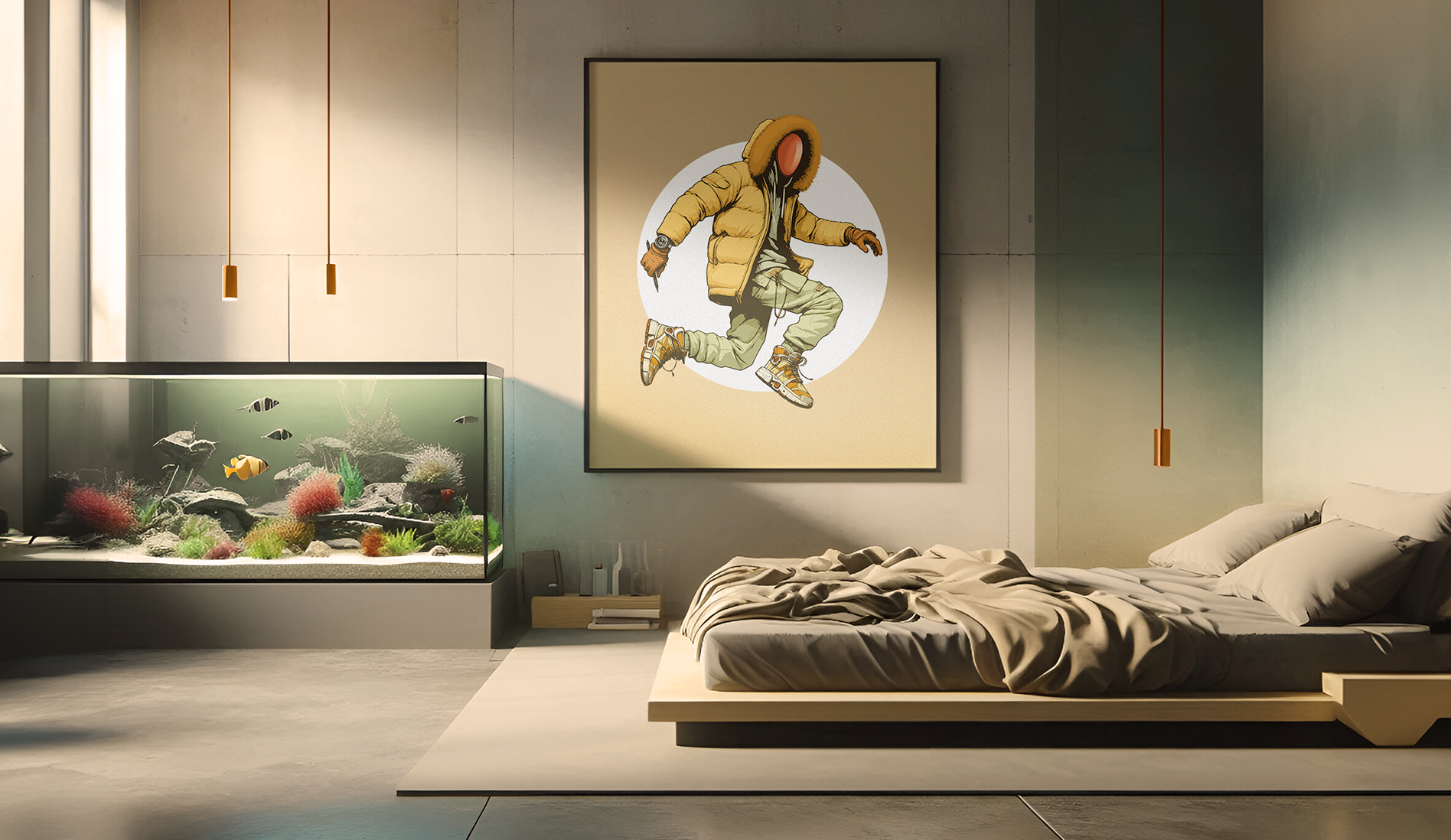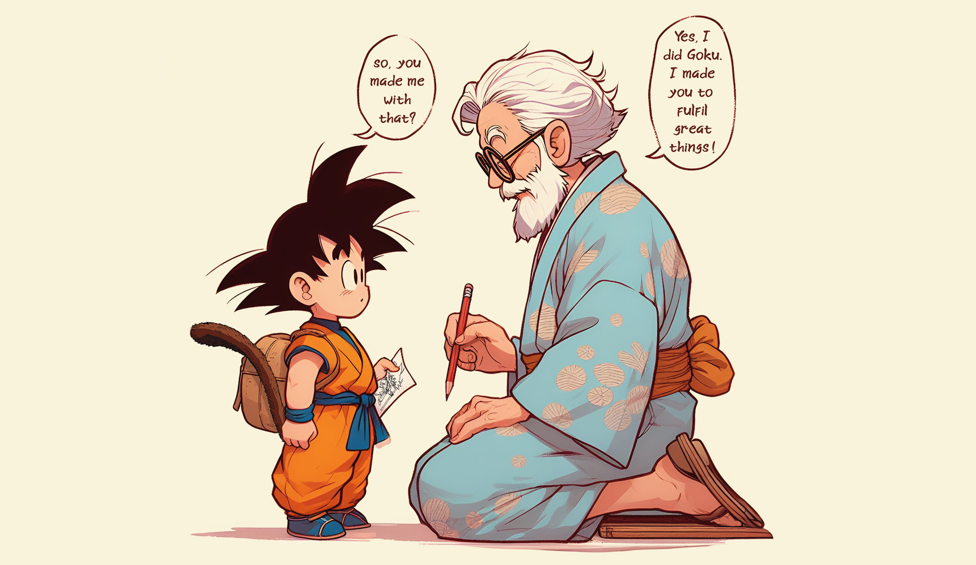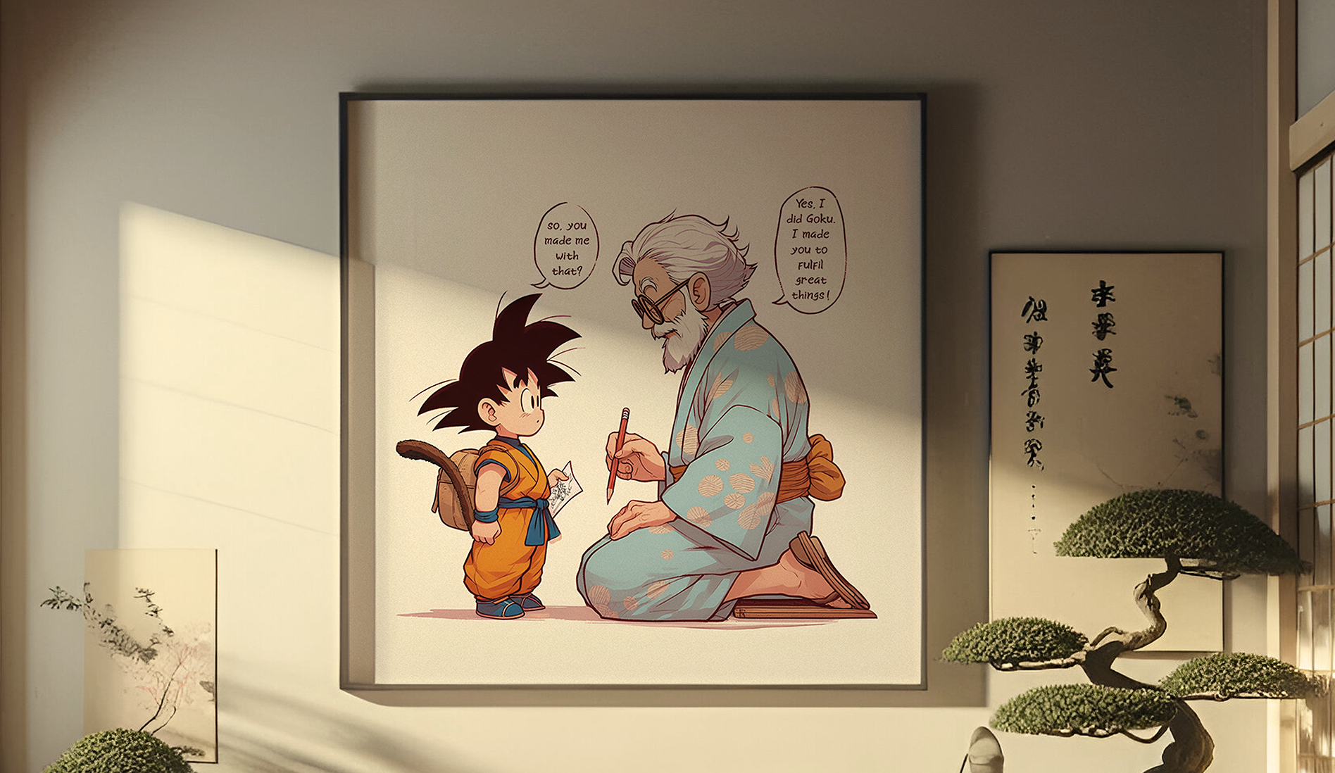 This piece is a tribute to Akira Toriyama, crafted soon after his passing. Portraying the artist with Son Goku, his most iconic character, in a touching exchange that conveys purpose and affirmation. The artwork represents the bond between the creator and creation, a statement of resilience and legacy. Drawne and painted in Photoshop, this piece was prepared in CMYK for 120x120(cm) print. An 'AI' mockup room, evokes a traditional Japanese atmosphere, paying homage to Toriyama's cultural roots. R.I.P.