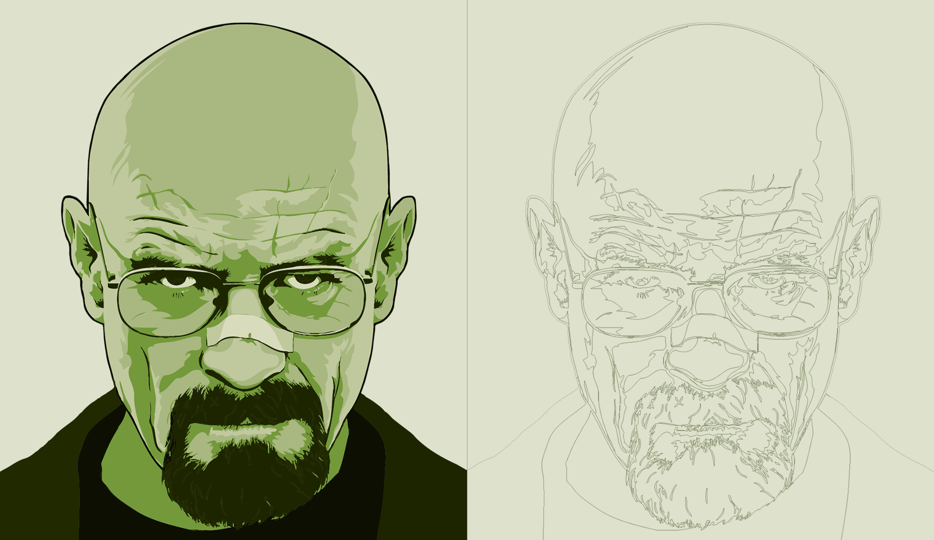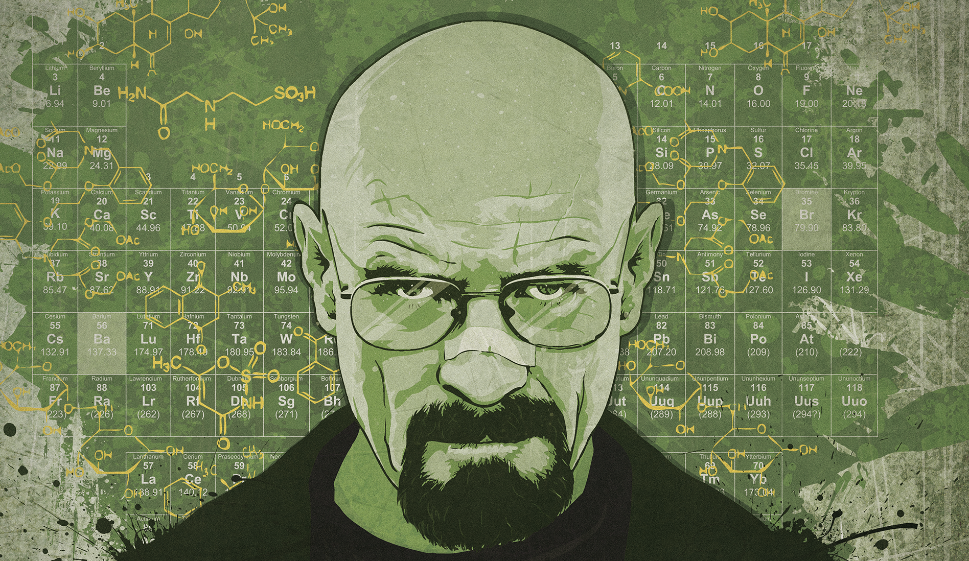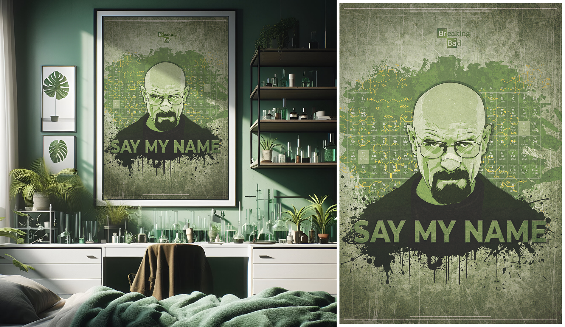 Tribute to the iconic series "Breaking Bad", capturing Walter White in his most infamous persona. Created in Illustrator with final touches in Photoshop, featuring the intense gaze of Walter, complemented by his memorable phrase "Say My Name". Behind him, a periodic table and amphetamine molecular structure echo the show's narrative. Produced for large-scale printing in CMYK at 84x119(cm). A retouched 'AI' room mockup adds subtle lab-like details, reminiscent of Heisenberg's world. Created in 2012.