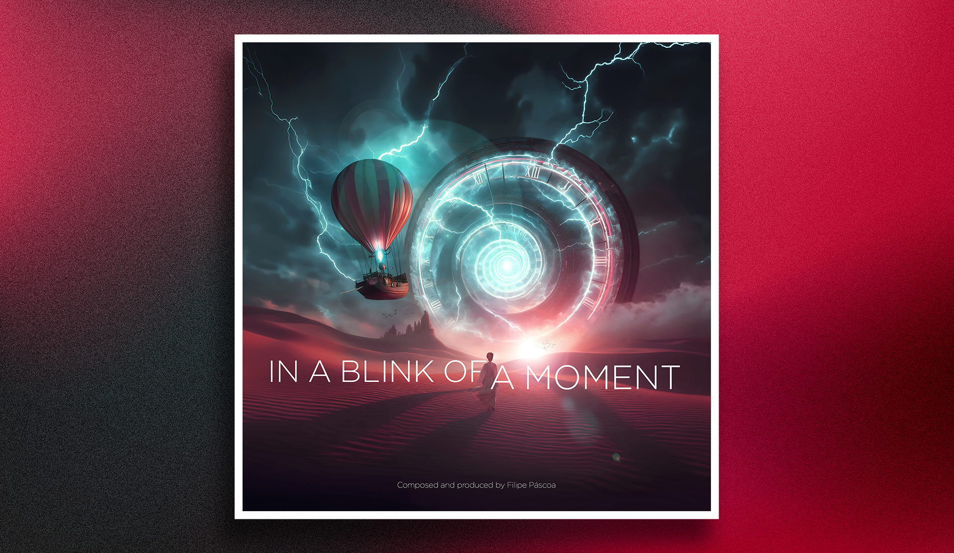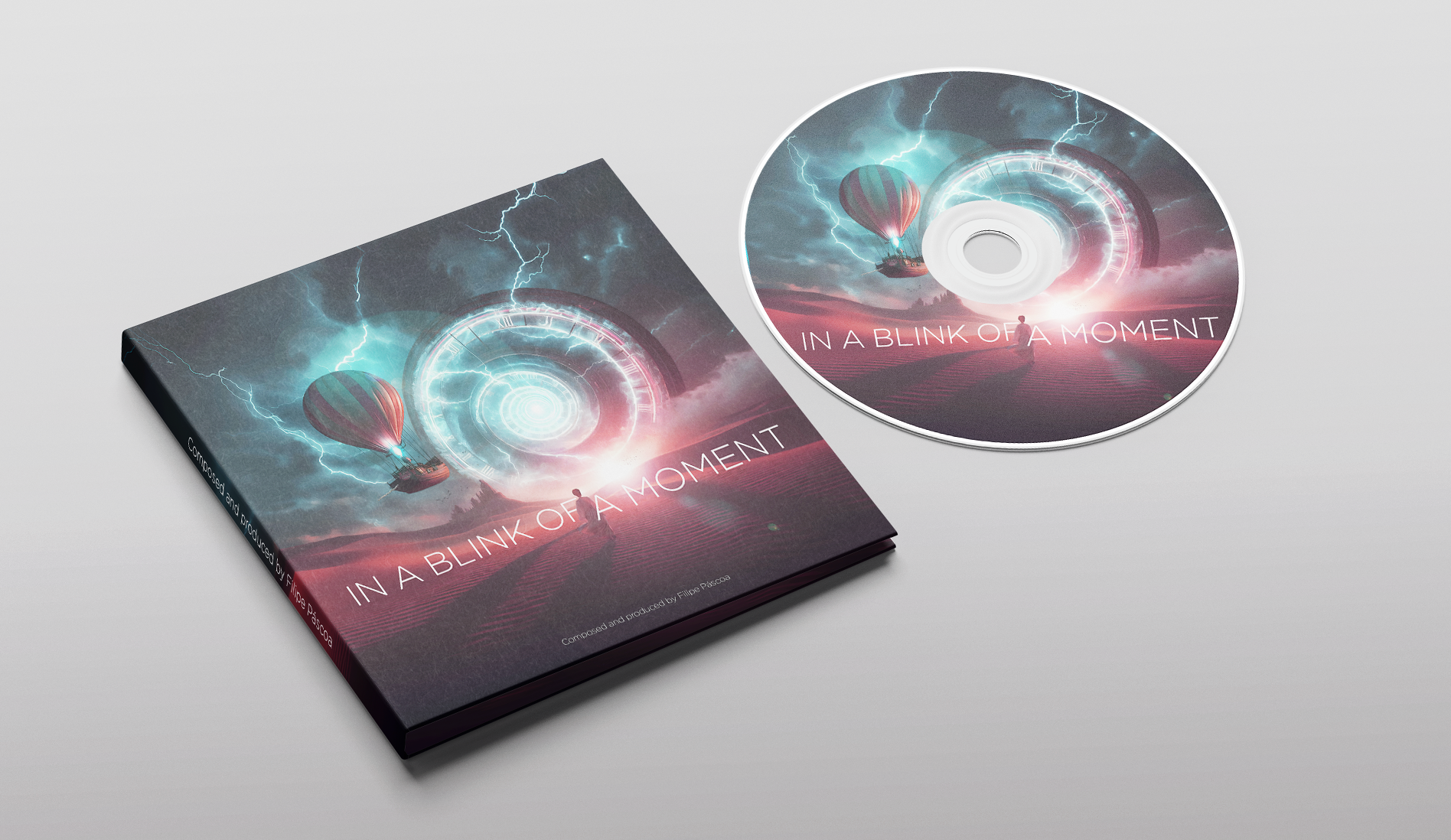 This album cover captures the essence of Filipe Páscoa’s music, merging surreal visuals with intricate design elements. The clock structure, mountain, and text were crafted in Adobe Illustrator, while the rest was a blend of edited photographs, composed in Photoshop. The scene brings a sense of timeless adventure, with elements like the clock portal and hot air balloon sparking wonder. Created in 2023, this artwork visually interprets the journey and emotions within the album, presented across multiple formats.
