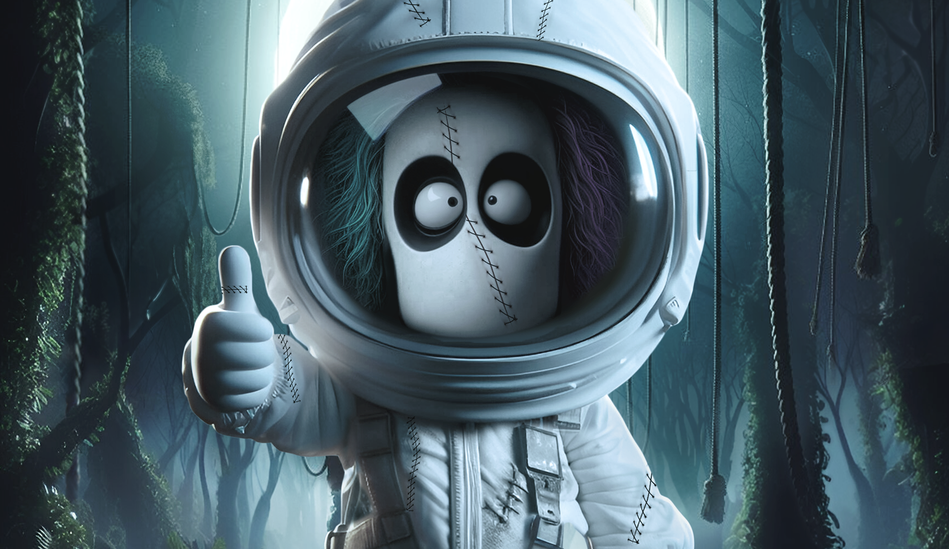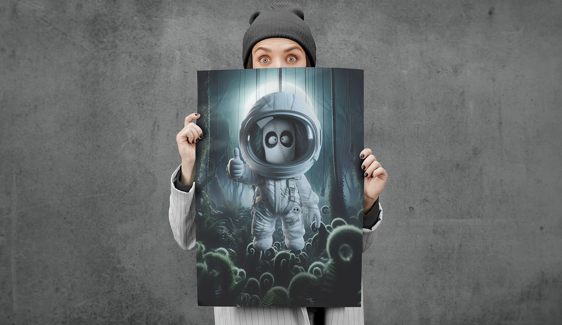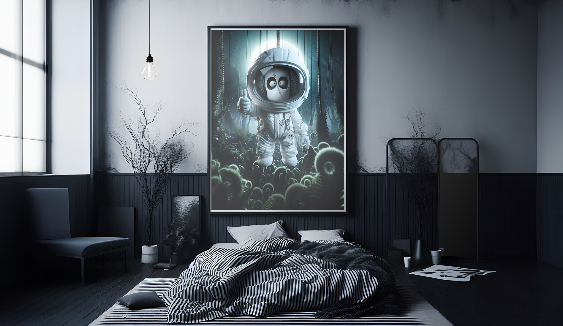 This piece showcases a cartoon astronaut character in a mysterious forest, inspired by Tim Burton's distinctive art. The artwork mixes photomanipulation with painted elements, all crafted in Photoshop. Finished in CMYK for an 84x119(cm) poster, the project emphasizes a whimsical and weird contrast that define the style. Finished in CMYK for an 84x119 cm poster, the project captures an surreal atmosphere. The room mockup was AI-generated and retouched for a cohesive presentation. Created in 2023.