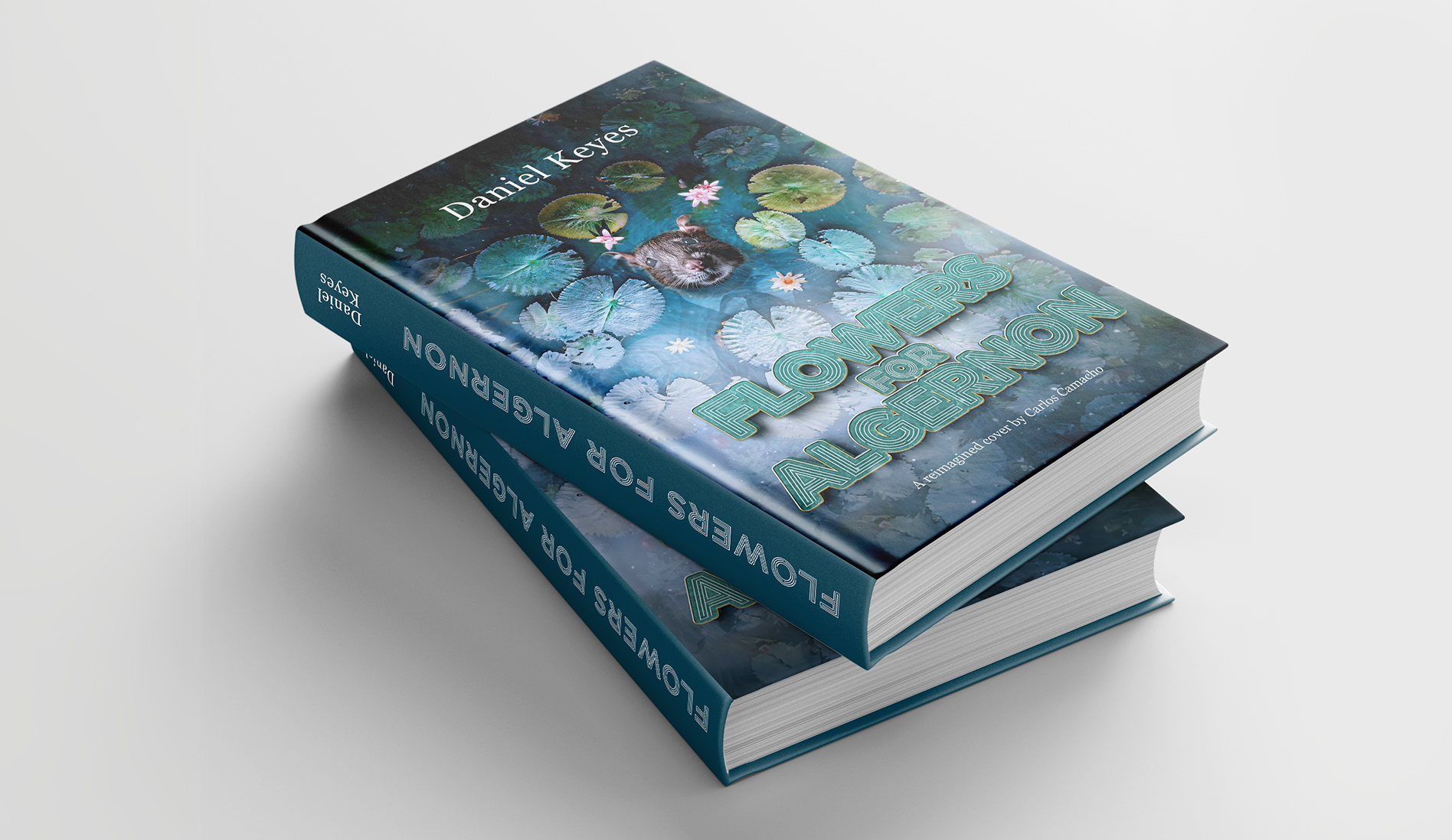 A reimagined cover for "Flowers for Algernon" reflects the emotional complexity of the story. The front was inspired by the painting of "Ophelia". Water lilies float above a serene pond, echoing the fluctuating mental journey of both Algernon and Charlie. The back cover, created in Illustrator, uses a maze featuring Algernon, capturing the symbolic pursuit of intelligence and self-discovery. This school project, created in 2023, blends visual symbolism with thematic coherence to honor Daniel Keyes' powerful narrative.