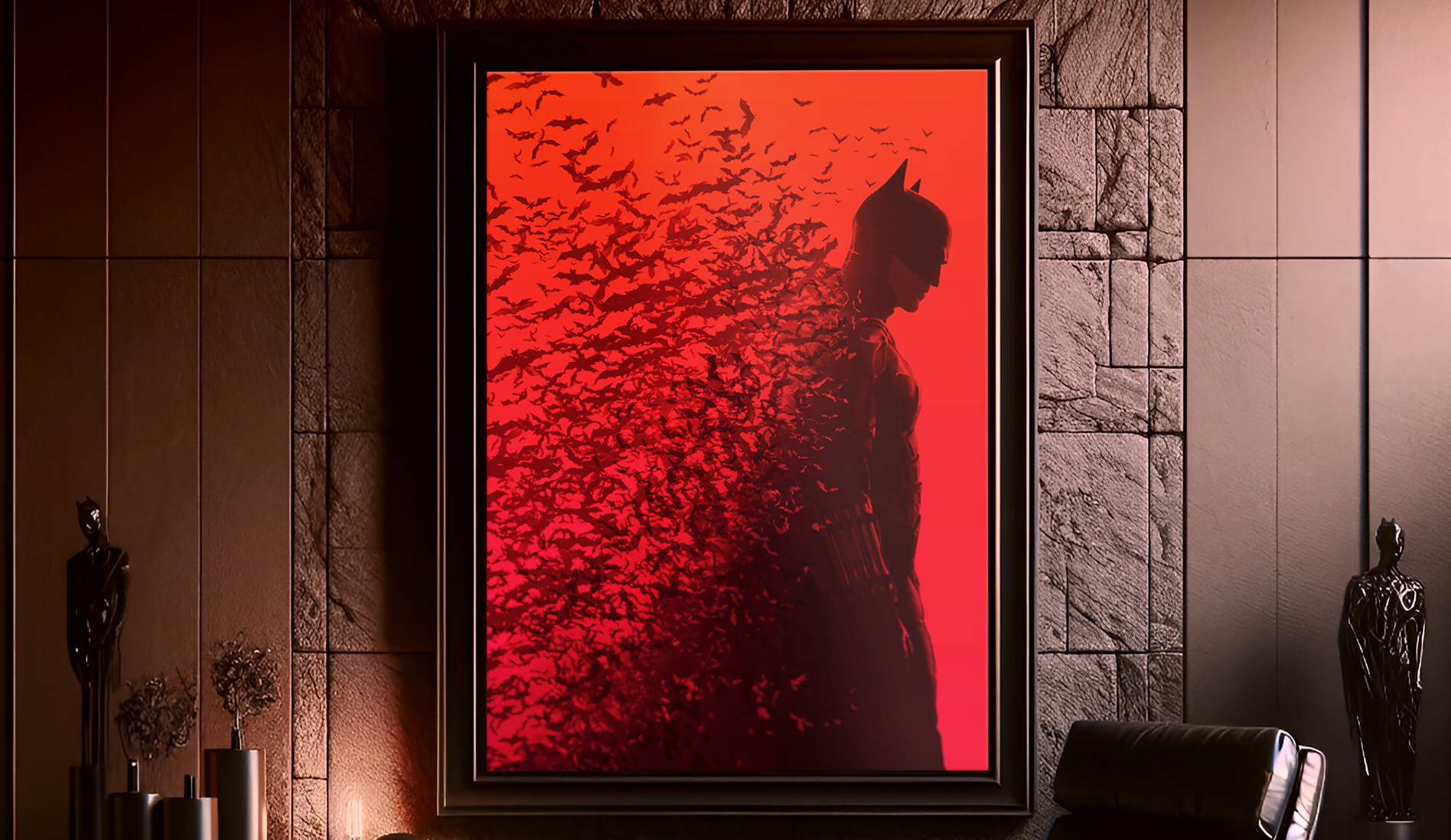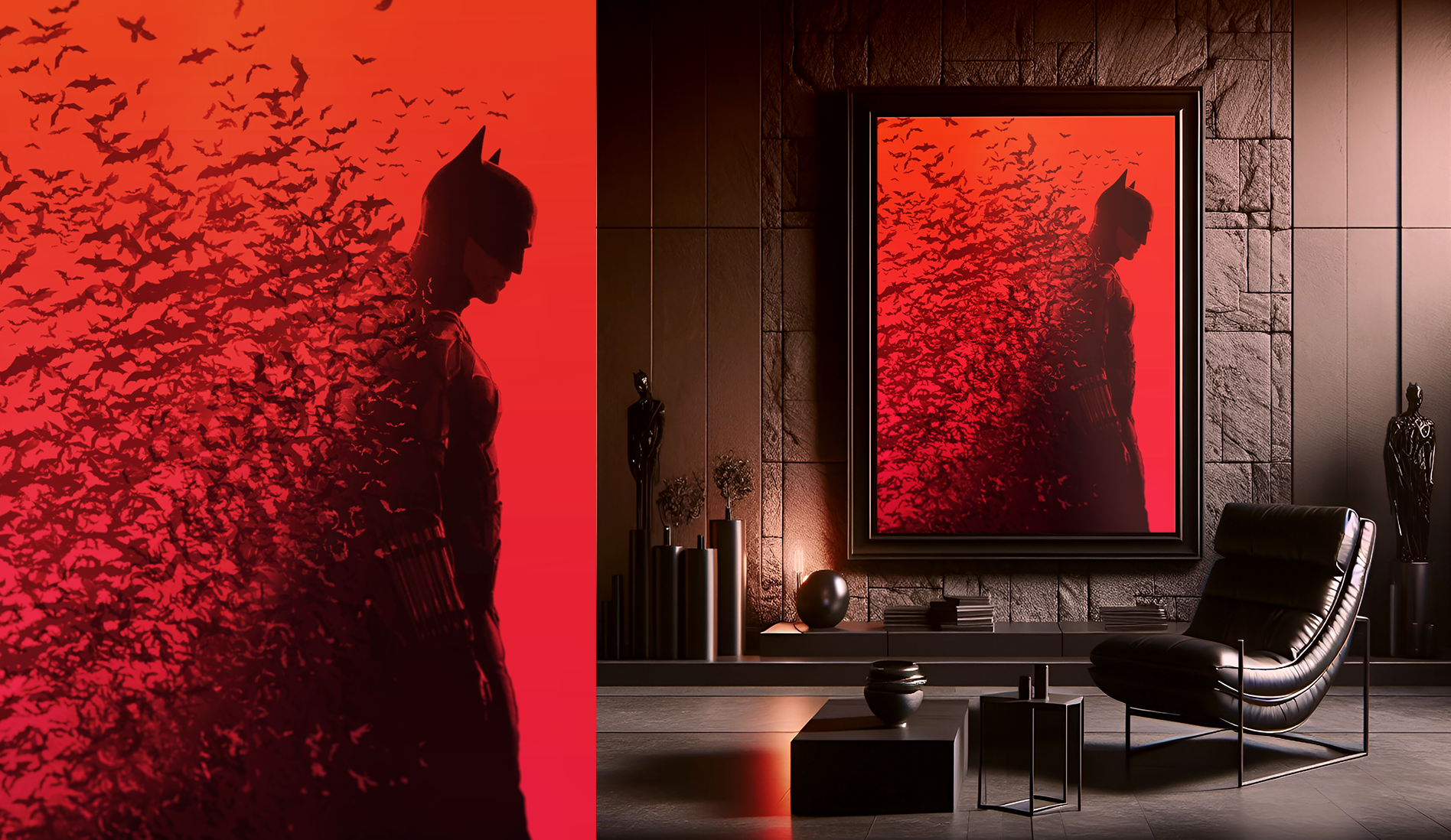 This artwork captures the essence of Batman's mysterious character, crafted in Photoshop. Started with an upscaled silhouette from the movie and created an atmospheric scene using brushes of bats scattering from the shadowed figure. Color and layer adjustments brought depth to this piece. Output prepared in CMYK and sized for a 70x100(cm) poster printing. A retouched 'AI' living room mockup, sets the artwork in a realistic context. Created in 2022 with a focus on bold contrast and visual storytelling.