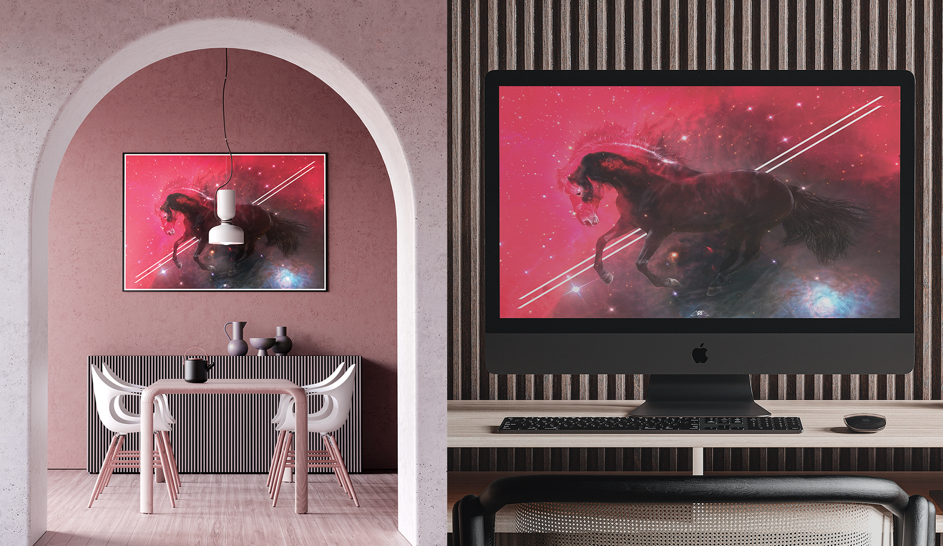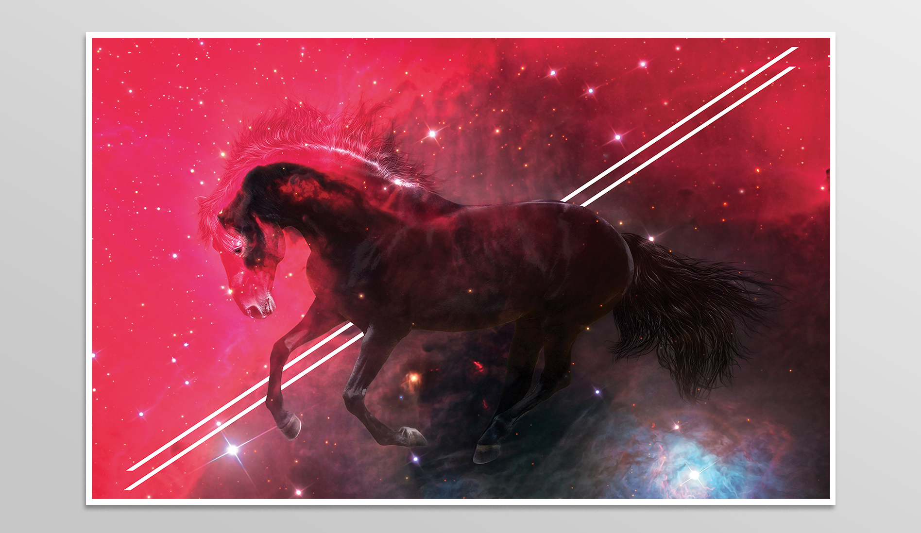 This artwork blends Earth & Cosmos, using a double exposure effect to combine a horse photograph with an infrared image of the Horsehead Nebula. Edited in Photoshop, the piece captures the horse movement against a backdrop of interstellar reds—shaped by hydrogen and magnetic fields from distant stars. Prepared in CMYK and scaled for a 70x100(cm) poster. Created in 2011, this work aims to evoke a sense of wonder at the interplay between earthly and celestial forces.