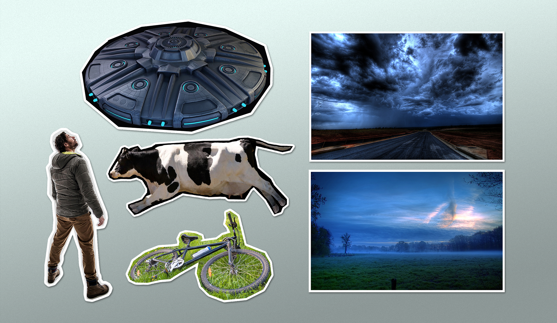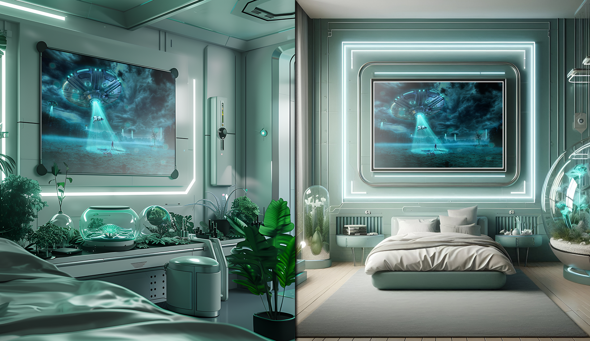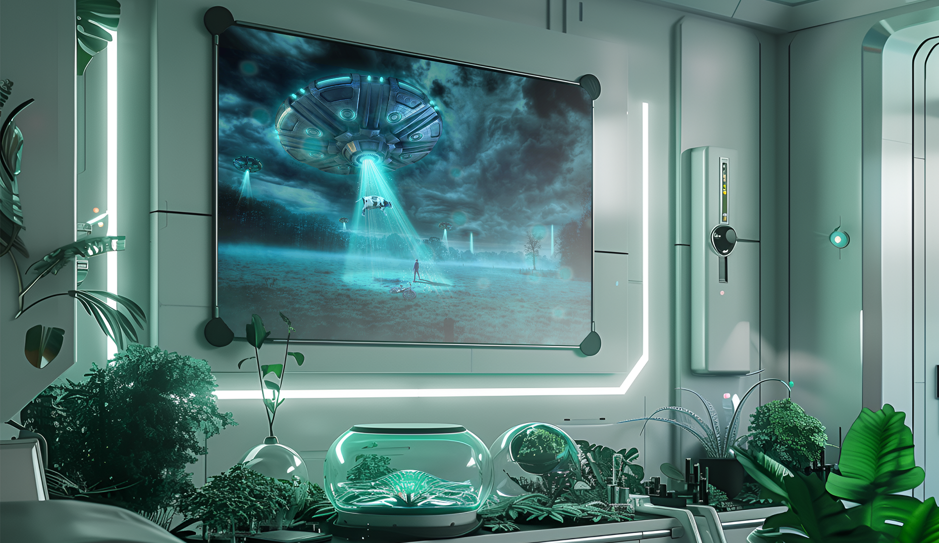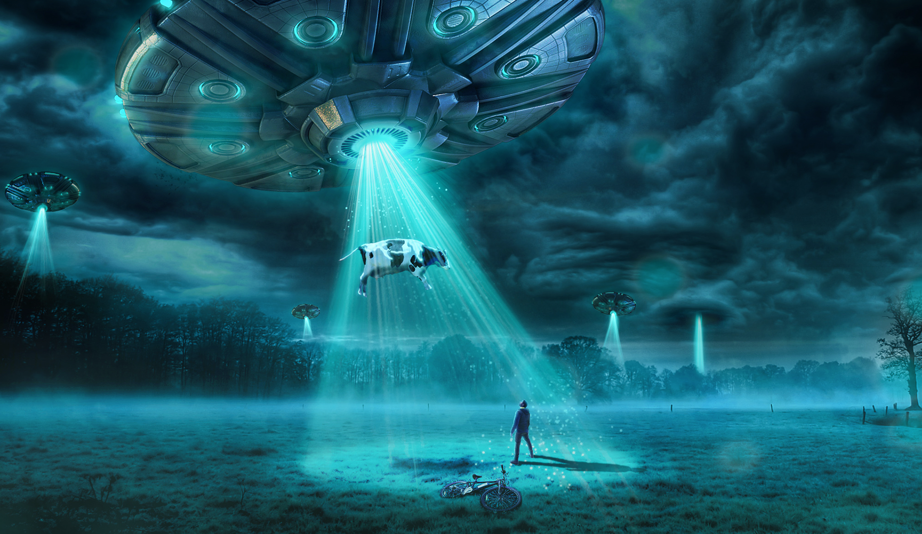 This photomanipulation captures a surreal alien abduction scene, blending different photographic elements into a cinematic moment. The image was crafted in Photoshop by editing various components. Color grading and atmospheric effects were applied to merge the individual pieces into a seamless, sci-fi environment, with cool blue tones adding mystery to the mood of the context. Finished in CMYK for a large prints, with 'AI' futuristic room mockups to set the poster in a unique context. Created in 2023.