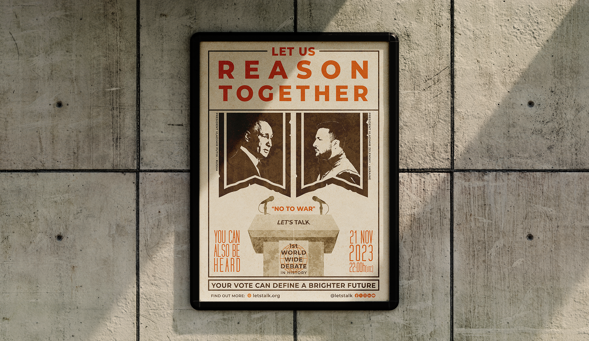 This fictional poster envisions a world-changing debate between Putin and Zelensky, promoting dialogue for peace. The artwork highlights the power of communication and collective involvement. A concept centered on a interactive debate, enabling worldwide interaction via Q&A submissions and votes, bridging the gap between leaders and citizens. Blending Illustrator and Photoshop, it mimics vintage protest posters through a halftone process for screen printing. Designed for a school project in 2023.