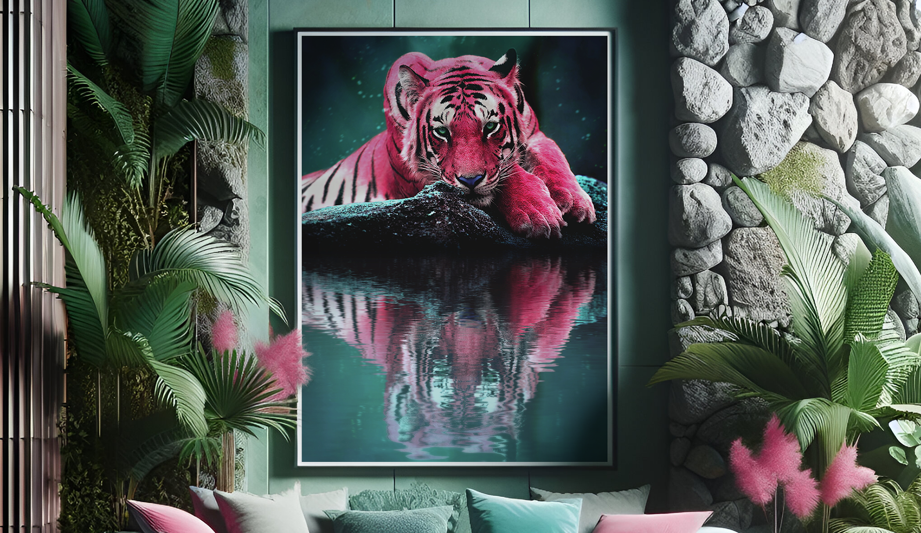 This image brings a surreal twist to the natural beauty of a tiger, resting with its reflection mirrored in calm waters. Created as an exercise in displacement mapping, the piece explores how reflections can be manipulated for realistic effects. Started with a tiger photo, where the colors were converted for a vivid, fantasy aesthetic, adding a rock from another source to enhance depth. The final piece was edited in CMYK for printing at 84x119(cm). The living room scene was AI-generated and retouched. Created in 2023.